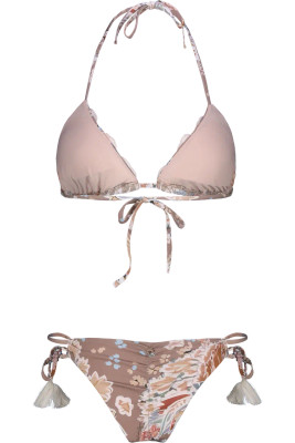 Il top a triangolo, con coppe removibili, presenta ricami in pizzo bicolor, creando un sofisticato "effetto lingerie". Lo slip brasiliana modella la figura con una copertura ridotta ma elegante, ed è dotato di una arricciatura strategica sul retro per esaltare e valorizzare le forme in modo naturale. I dettagli ricamati si ripetono sui fianchi dello slip, un tocco di savoir faire e femminilità.